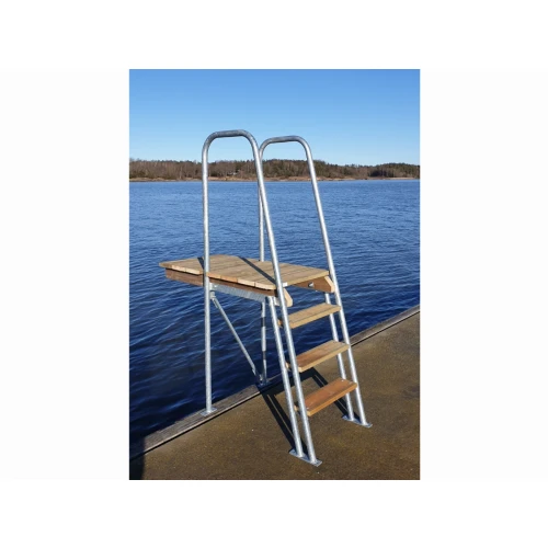 Standard konstruksjon i samme design som badetrappene. Festes i bryggen. Høyde 1m. Bredde platting 0,6m.