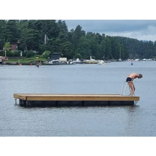 En solid badebrygge med mye oppdrift, kjettingfester i alle hjørner, dobbeltrørbadetrapp med hurtigfeste.