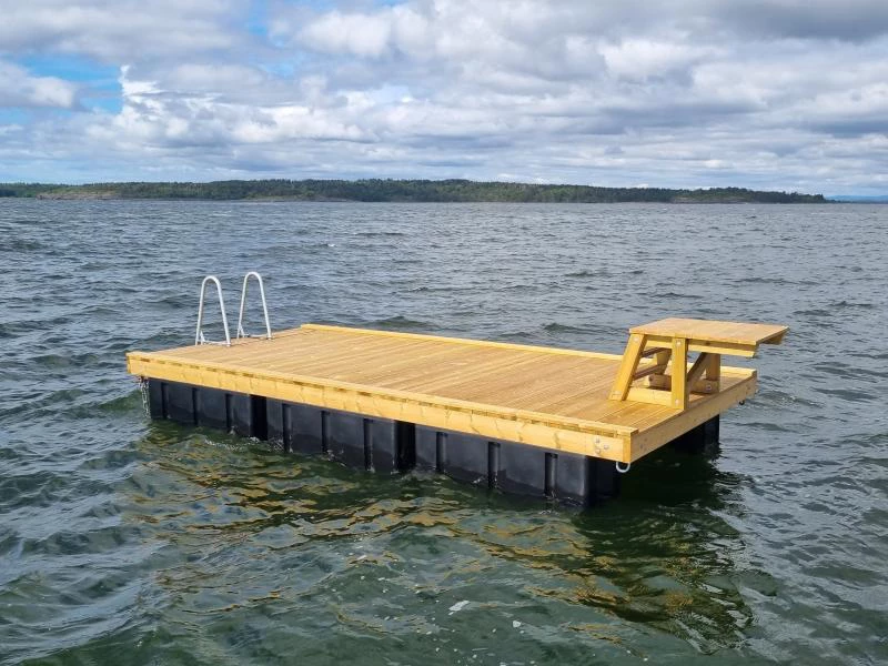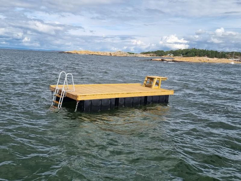En solid badebrygge med mye oppdrift, kjettingfester i alle hjørner, dobbeltrørbadetrapp med hurtigfeste og ett 0.5m stupebrett.