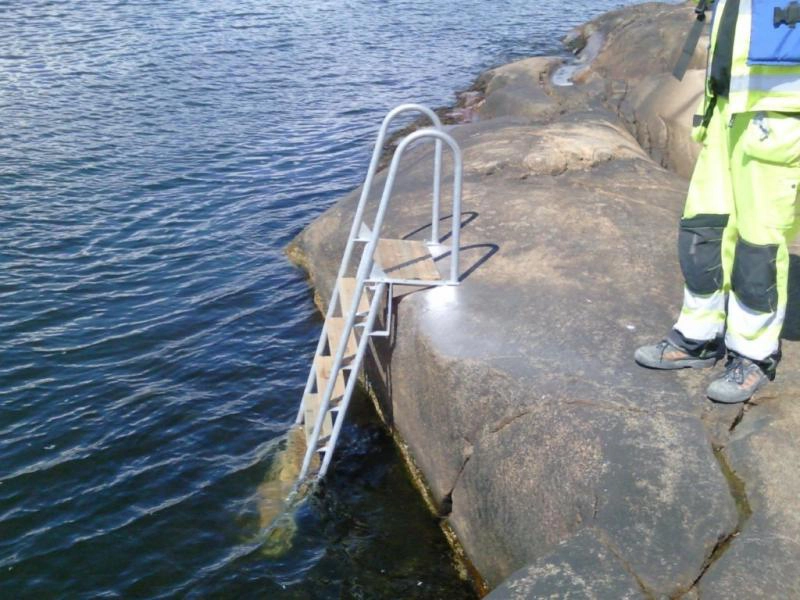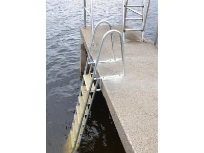 5 trinn. Bredde 0,6m, Høyde ca 1,25m fra bryggekant. Høyde på bøyle: 0.7m