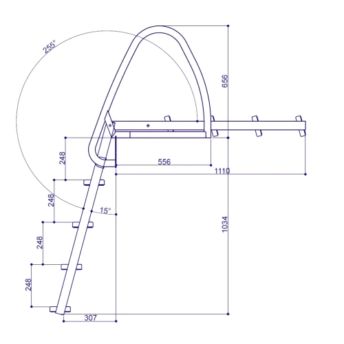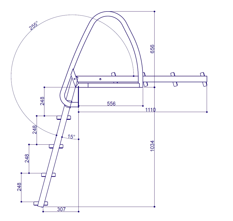 Badetrapp, 6 trinn med tretrinn, rustfritt, syrefast A4 med vipp (for flytebrygge eller fast)