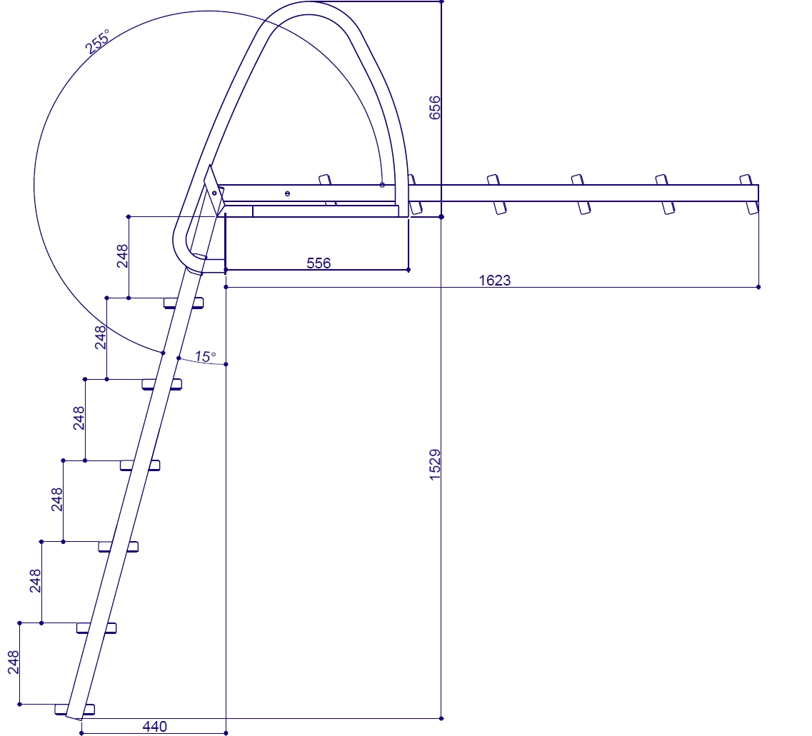 Badetrapp, 6 trinn med tretrinn, rustfritt, syrefast A4 med vipp (for flytebrygge eller fast)