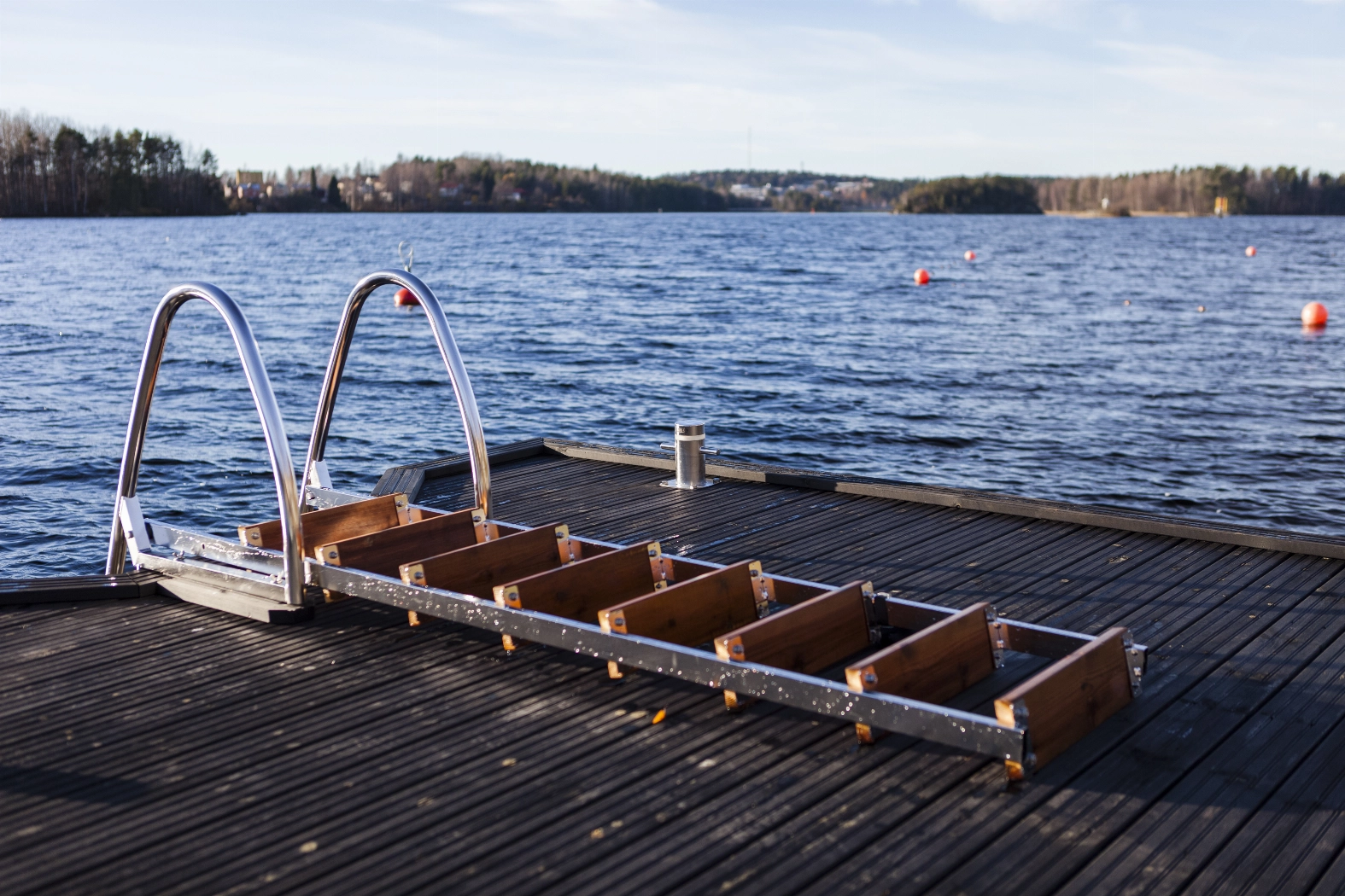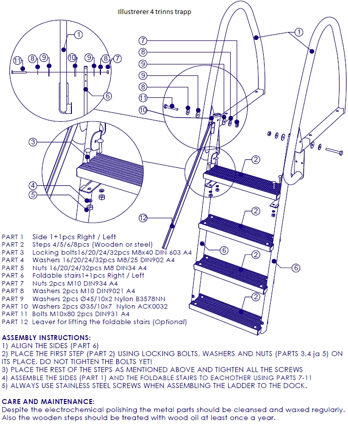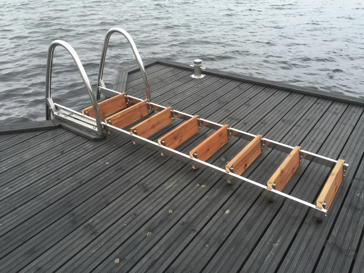 Skal trappen festes i trebrygge, se under tilbehør på denne varen for montasjeskruer.
