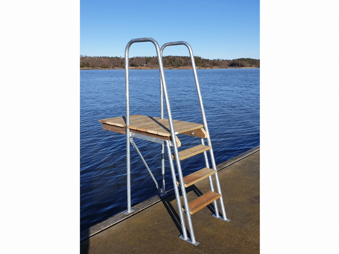 Standard konstruksjon i samme design som badetrappene. Festes i bryggen. Høyde 1m. Bredde platting 0,6m.