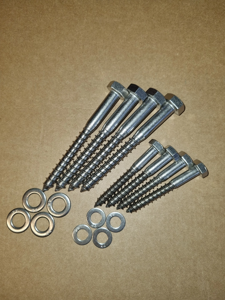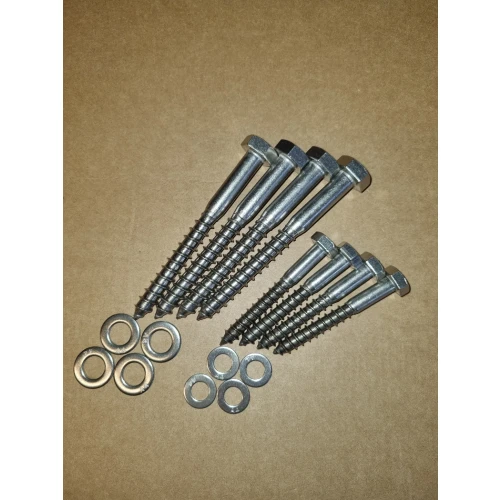 Pakken består av 4 store franske treskruer og 4 mindre franske treskruer med skiver, for å montere våre syrefaste premium badetrapper i trebrygge.