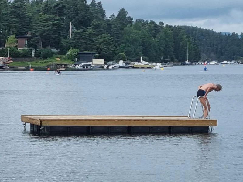 En solid badebrygge med mye oppdrift, kjettingfester i alle hjørner, dobbeltrørbadetrapp med hurtigfeste.
