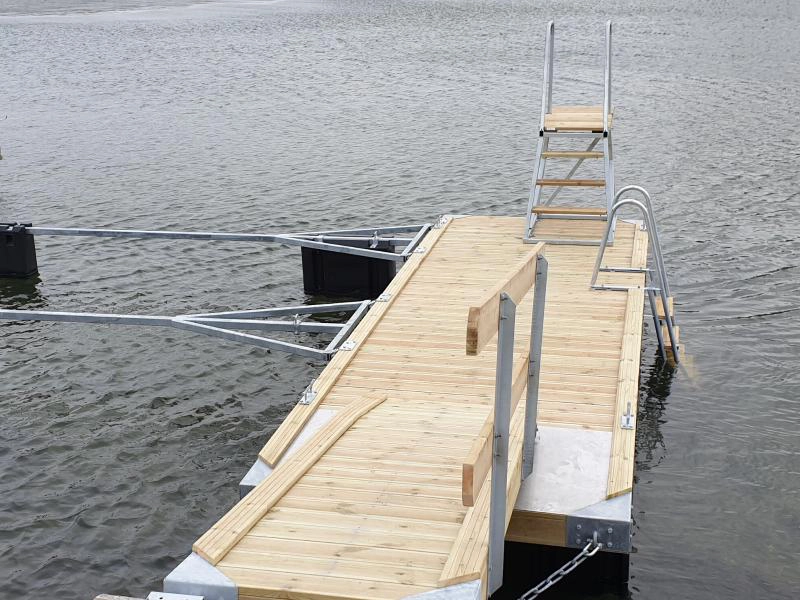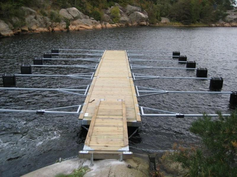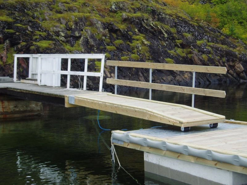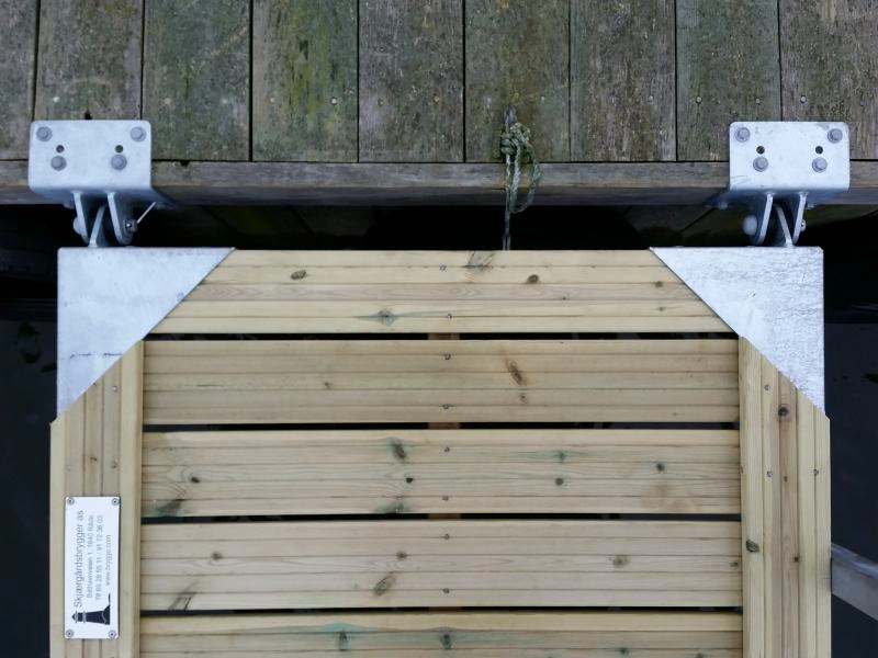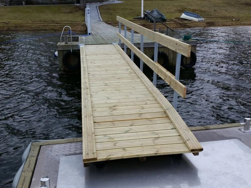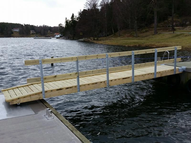 Landgang i trykkimpregnert treverk med galvanisert landgangbeslag (inkludert). Bør legges ann på en skliplate på bryggen. Tillegg for glideklosser i forkant. Glideklossen må legges ann på en sliteplate. Glideklossen gjør at bevegelsen mellom landgangen og bryggen ikke lager sjenerende lyd Lengde 3m, bredde 1,0m. (Bredden kan variere fra 0,95 til 1,05m)